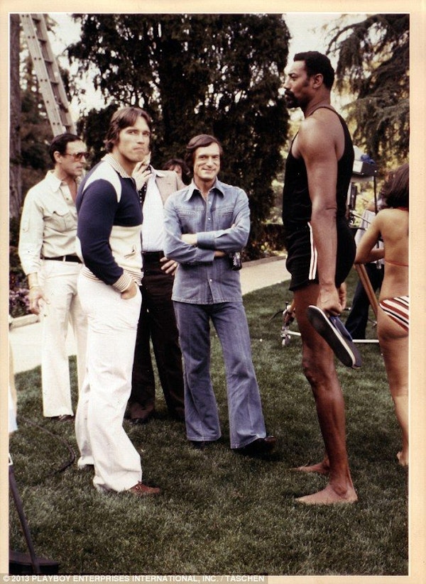 4. Arnold Schwarzenegger, Hugh Hefner & Wilt Chamberlain at Playboy Mansion West in 1977.